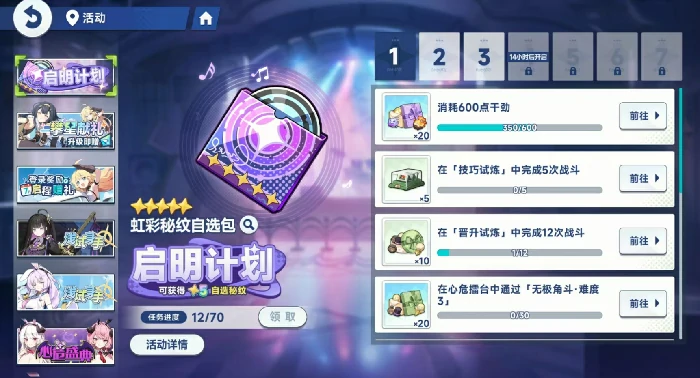 活动面向新手开放,每日更新任务,次日解锁新任务,最快7天完成全部。未完成任务可后续补做,不会失效。资源消耗类任务支持累积计算,如消耗体力任务:前一天消耗300体力,新任务要求600体力,只需再消耗300即可达成。活动无时间限制,可自由安排进度。
