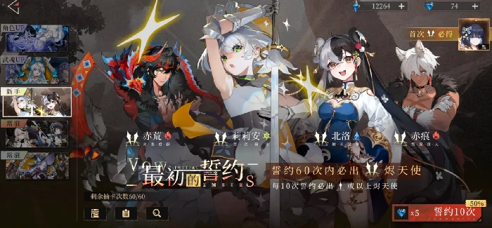 新手卡池同步推荐,享50%折扣,部分角色与UP卡池互通,保底机制一致,60抽必出最高品质烬天使。
