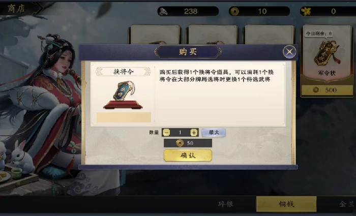 变阵令和换将令是商店重点兑换道具。变阵令能在对局中调整手牌组合,提升战局应对灵活性;换将令允许更换武将,实时调整战术。这两类道具在高强度对局或排位赛中能左右战局结果,虽无每日购买上限,但有使用次数限制,玩家要根据实际需求合理分配铜钱,避免浪费。