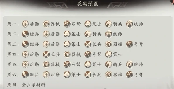 每日三级奖励必拿,投入体力是重点,冰系材料要攒够,后期兵种升级、技能解锁全靠它。兵器材料每日轮换,当天没需要的就囤体力。首周刷统帅、后勤材料,二周换后勤、骑兵,三周主攻后勤、器械,四周集中长兵、弓弩,五周再刷统帅、器械。周日材料全开放,体力投入最划算。