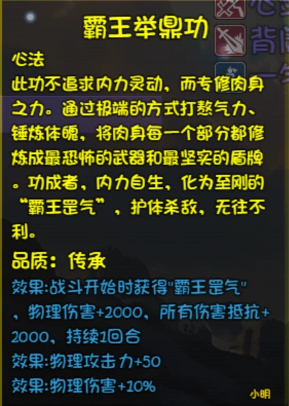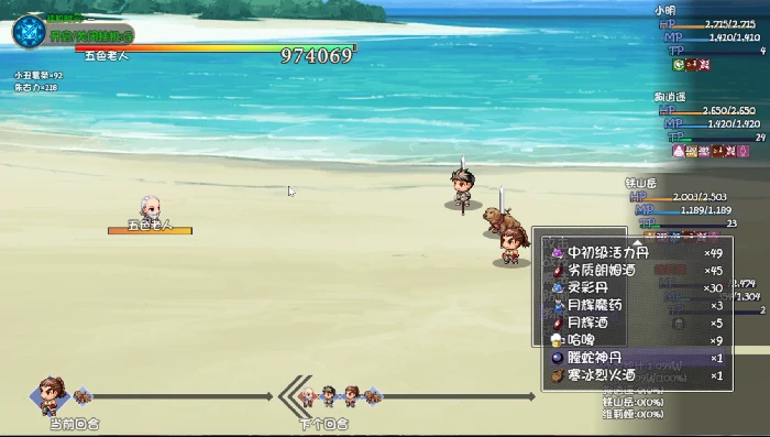 五色老人出现后持续攻击,装备霸王举鼎功角色承伤,第二回合自动胜利。