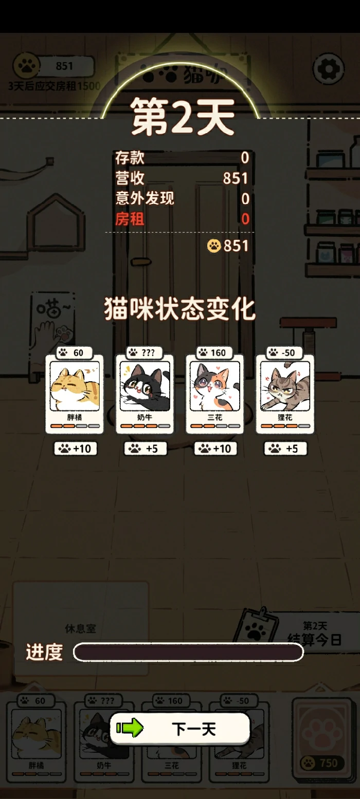 猫咪头顶显示经营能力,数值越高收益越好。