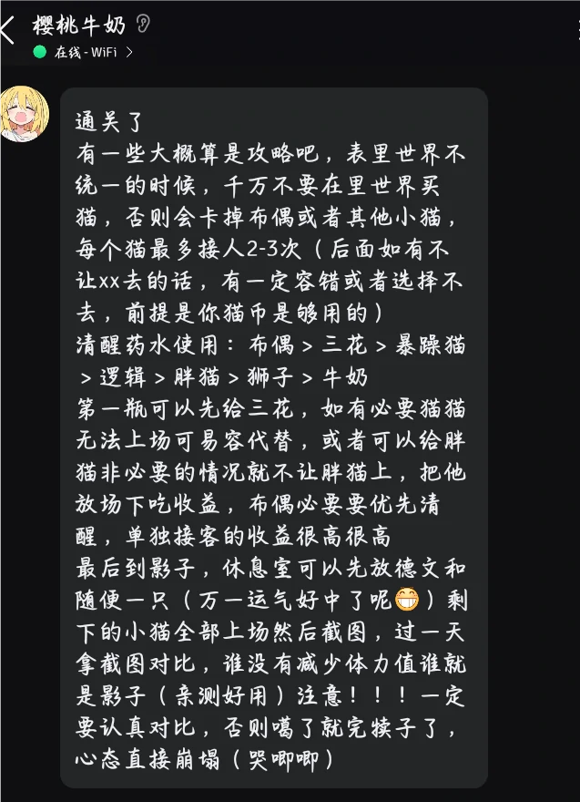 技巧:触发后,随机将一猫与德文关入小黑屋,其余全部上岗(确保无“不消耗精力”规则)。运气好可当日结束,否则次日处决精力满的猫(胖橘词条不耗精力,调整位置确保所有猫消耗精力)。