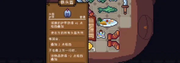 萌新入门首推防御型装备。铁头盔放置护甲旁,每回合加1额外格挡,右侧头盔失效,固定获2格挡。选带刺头盔,叠加4刺甲值,保留失效特性。