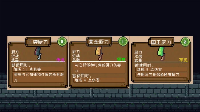 菜刀种类多样,各带属性:连续攻击、伤害叠加、附加流血。相邻摆放激活协同增益,实现1+1>2战斗效果。