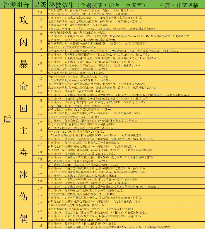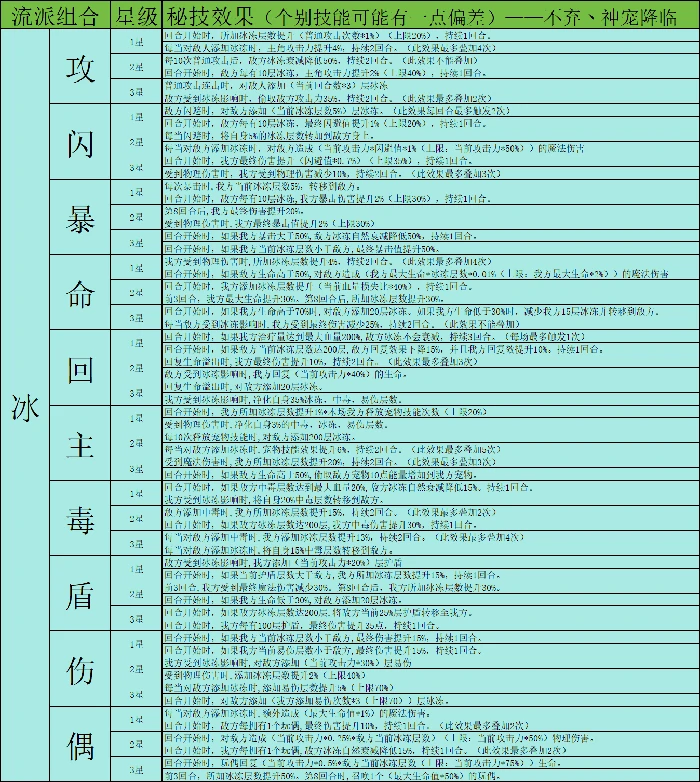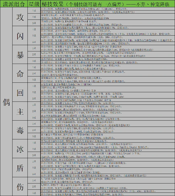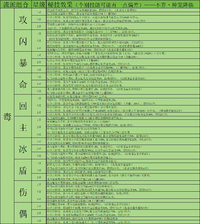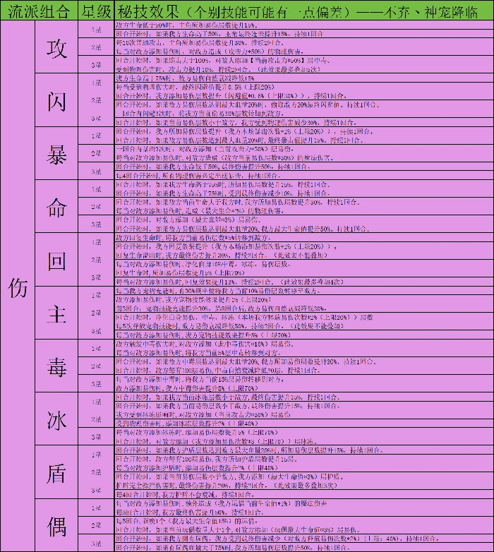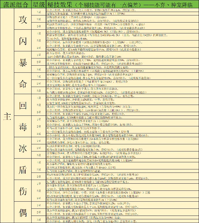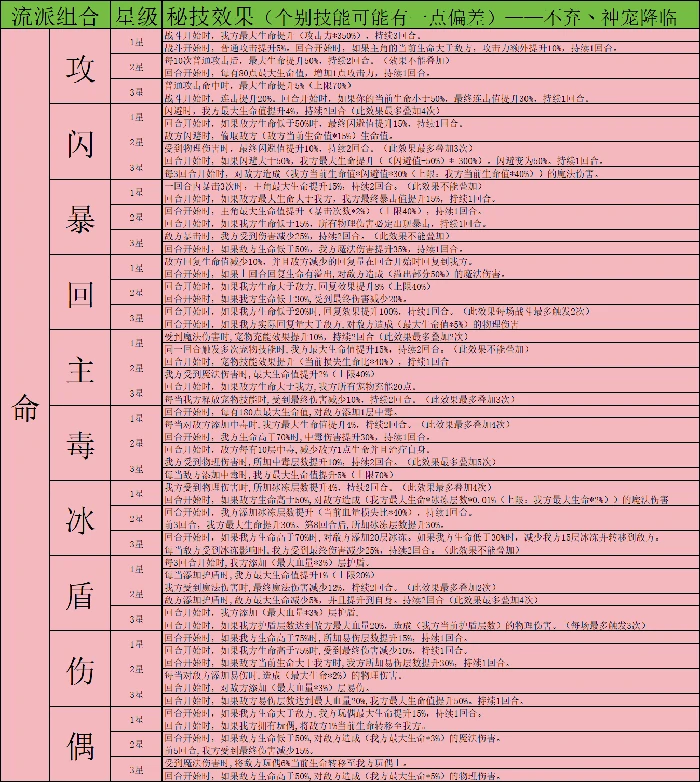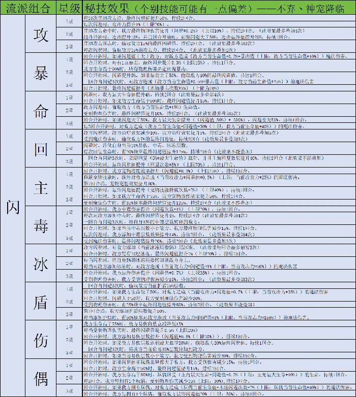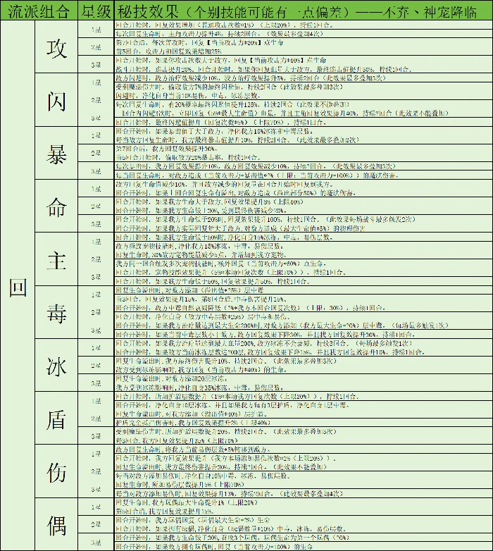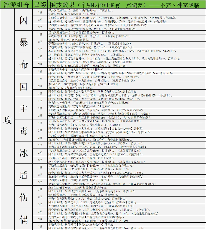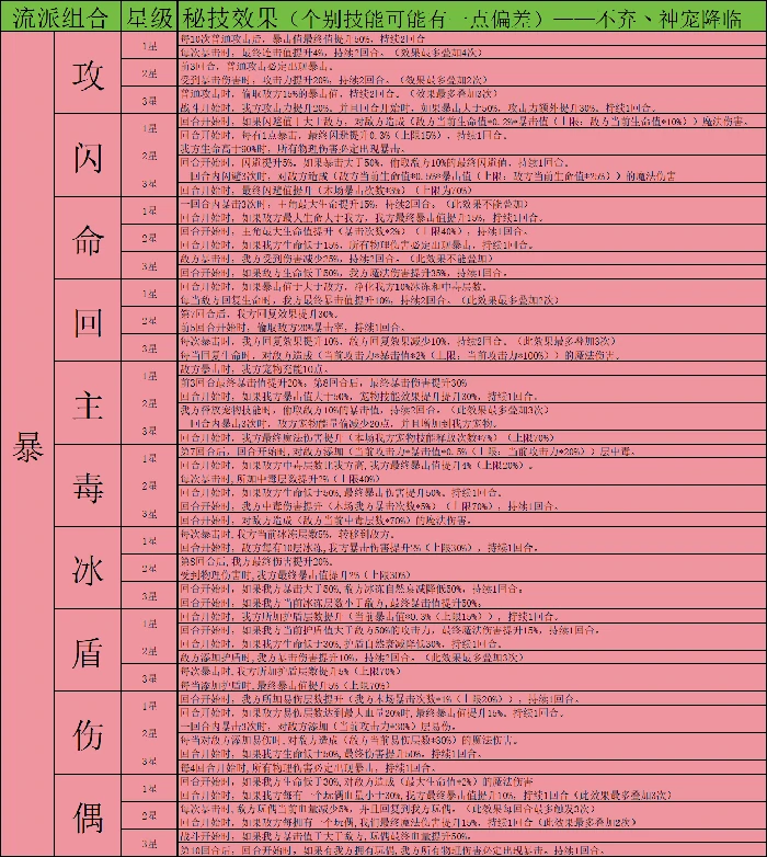 秘技种类丰富,表格图片展示流派及对应秘技,助玩家保存研究。