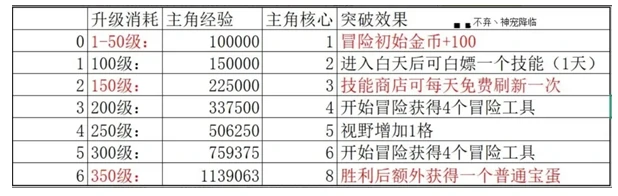 英雄升级:消耗英雄经验+英雄核心,最高1000级。升级提升基础属性,增加冒险加成。1-350级资源及突破效果见下图。