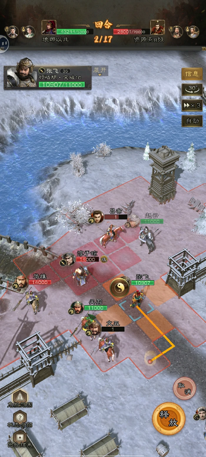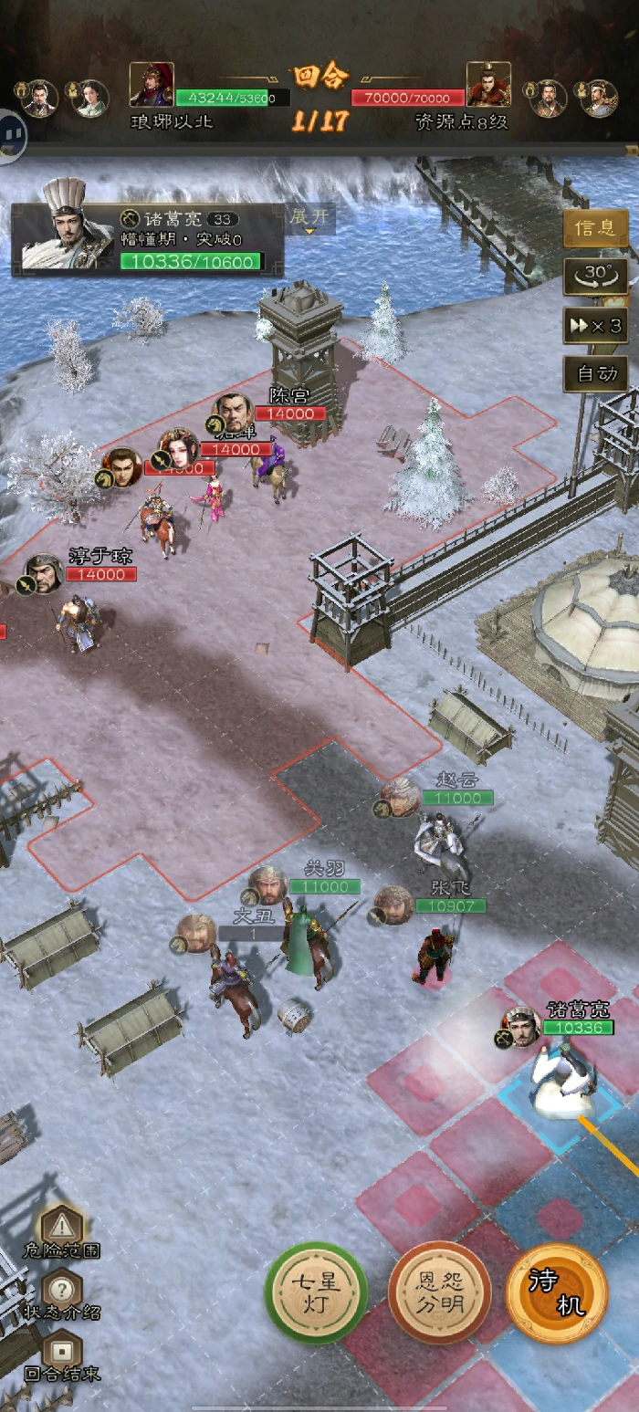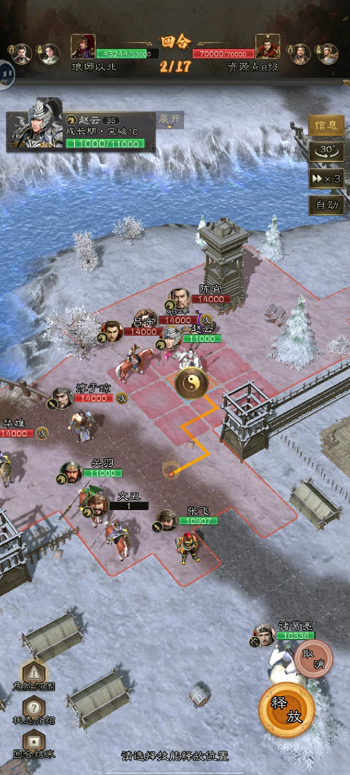 3. 第二回合:首次行动抵达指定位置,赵云发动云大怒;诸葛亮释放全队再动技能。