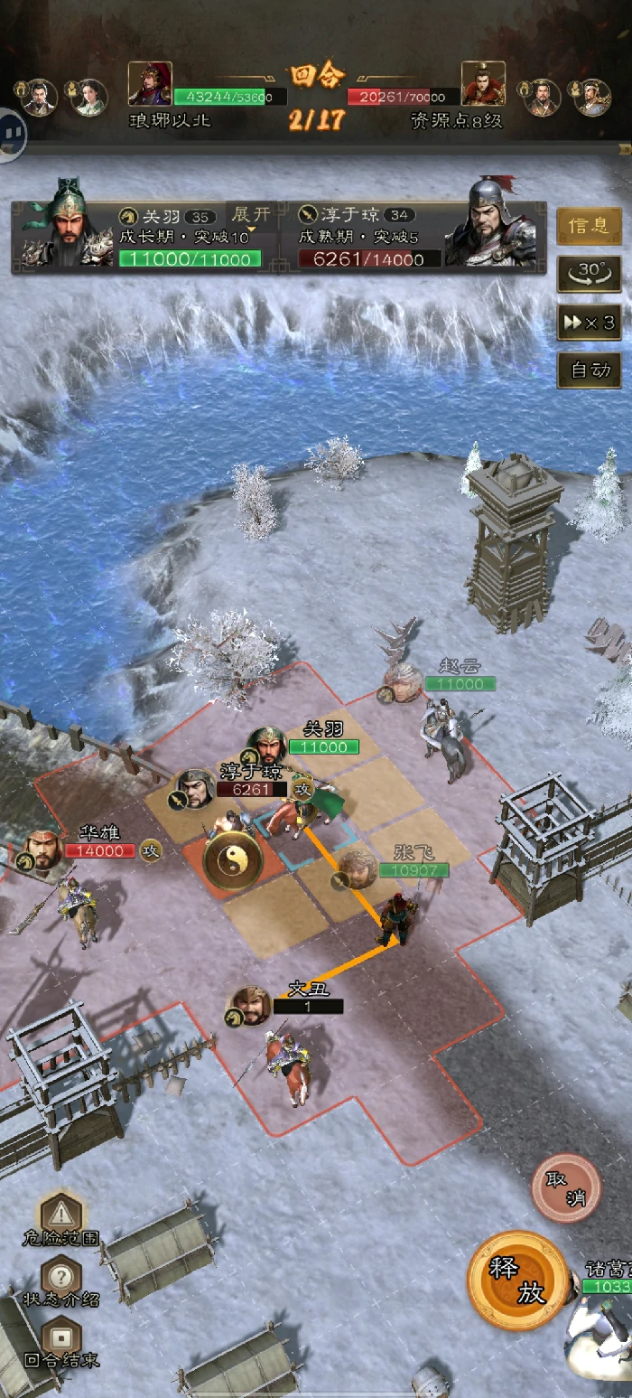 6. 关羽使用一技能清理残血;文丑前进至华雄面前,施放技穷控制。
