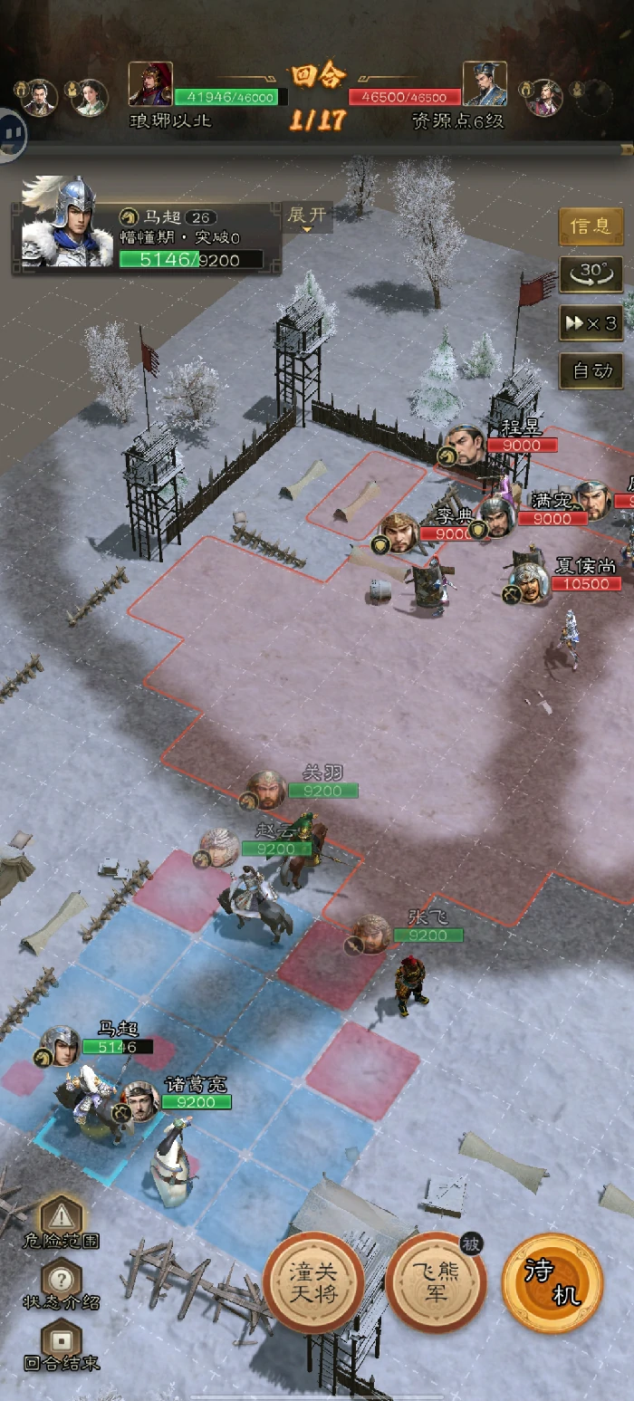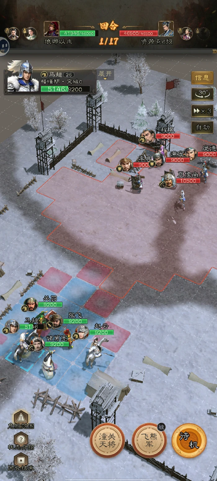 第三步:关羽、张飞、赵云集体前压,赵云施展云之怒,诸葛亮发动全队再动,张飞二动AOE削弱敌军状态