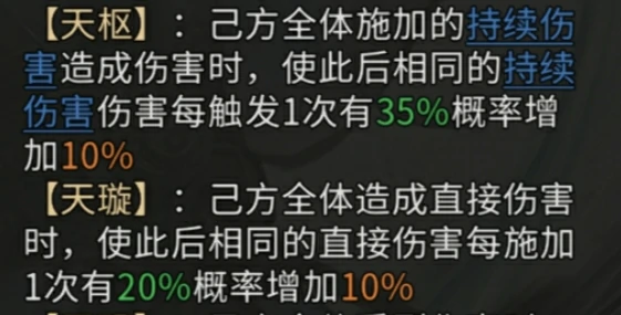 全能型辅助,提供多样增益与减益,概率触发队友额外行动,补充持续伤害。对甘宁核心增益来自天璇、天权与瑶光技能