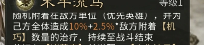 与诸葛亮觉醒技能配合,每回合木牛产生三层机巧效果,后期三木牛稳定维持减益与治疗,为甘宁创造输出环境