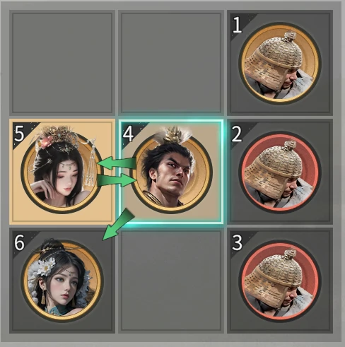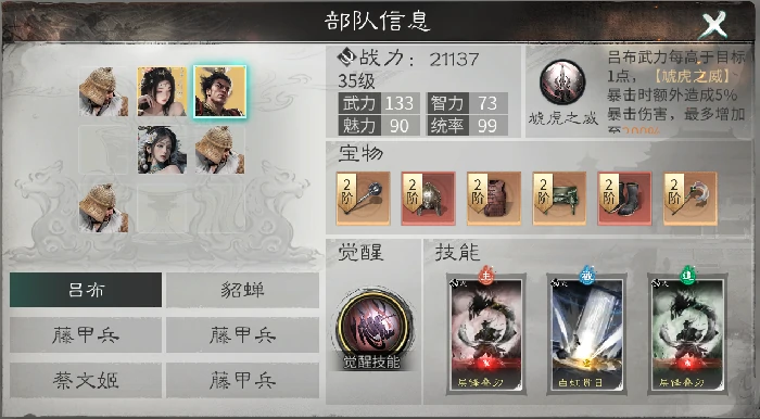 注意要点:貂蝉优先高阶级魅力类技能,确保魅力值高于敌方所有单位。蔡文姬可放弃追击技能,吕布追击格分配给貂蝉,最大化辅助控制效果。
