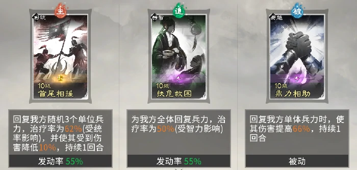 蔡文姬技能配置:主动技用首尾相援,治疗友军+减伤;被动选鼎力相助,提升受治疗单位伤害;追击技能带扶危救困,全体治疗+触发增伤。