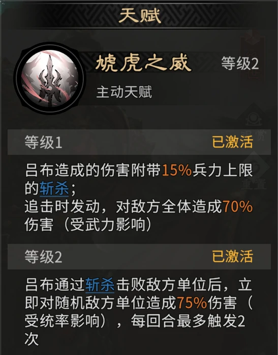注:所有橙色数值受英雄四维属性影响,吕布天赋加成随武力提升而增强。