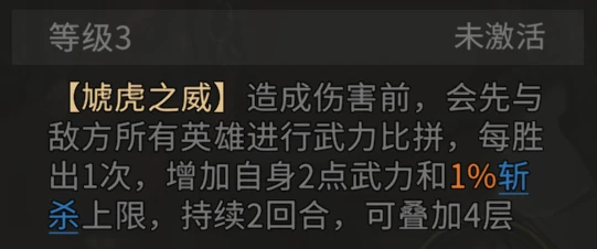 吕布天赋高度依赖追击效果,务必抢占两名队友追击格。1级天赋发力,自带15%斩杀线,追击触发70%全体伤害。升级2级,斩杀后追加攻击,强化收割能力;升级3级,新增武力比拼,提升自身武力,拔高斩杀上限,输出再增。