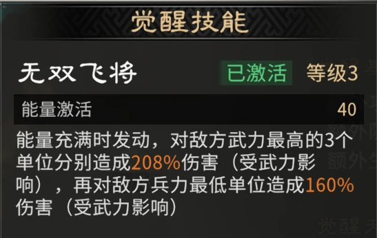 觉醒技能弥补吕布天赋单体伤害短板,提供高额单体输出,锁定兵力最低单位攻击。觉醒伤害可触发天赋1级斩杀及2级追击效果。鉴于天赋强度,建议玩家获取三皇后,优先觉醒吕布。