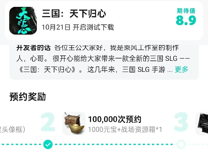 TapTap平台完成游戏预约,领1000元宝和战场资源箱,奖励比官方预约丰厚。