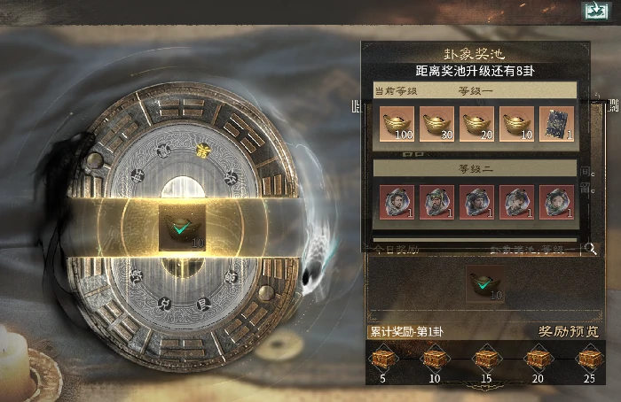 福利系统每日卦象固定领元宝,连续签到累积天数奖励,额外赠元宝及其他资源。每日坚持领取,长期拉开资源差距。