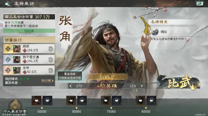 挑战名将用单体爆发型武将,搭配双增伤技能反复尝试。玩法无次数限制,多次挑战拼暴击概率,打出高伤领全部奖励。伤害达20万、50万、100万等阶段得卡包与银币,奖励诱人。
