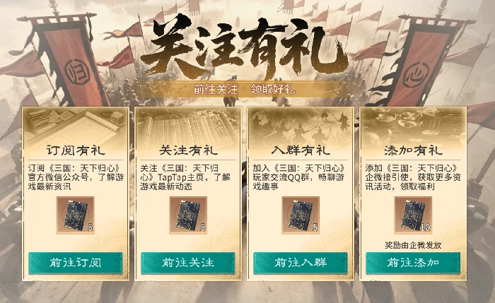 福利区关注有礼是获取卡包重要途径,按步骤完成关注任务,领25个卡包,快速扩充武将和技能库。
