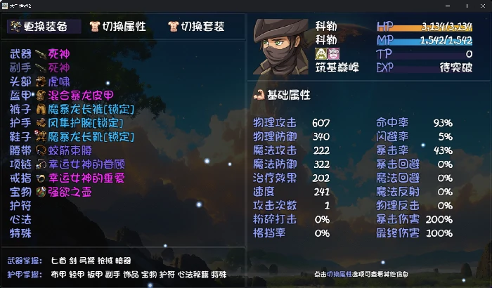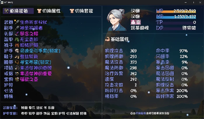 全员筑基后更新装备、心法(小明和汉娜要圆满突破,教汉娜治疗术;王烈普通突破后学猛虎跳涧)。