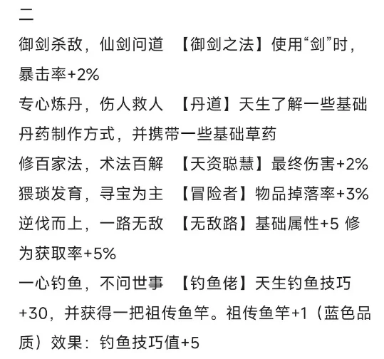 2.谨慎发育,以寻宝为核心(若后续想加入天剑宗需选御剑杀敌。注:偏好挑战可选此路,选择丹药路线可进药王谷,但会损失3%掉宝率,开局属性略低于其他门派)