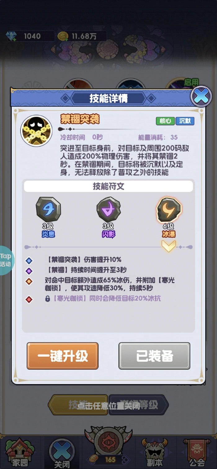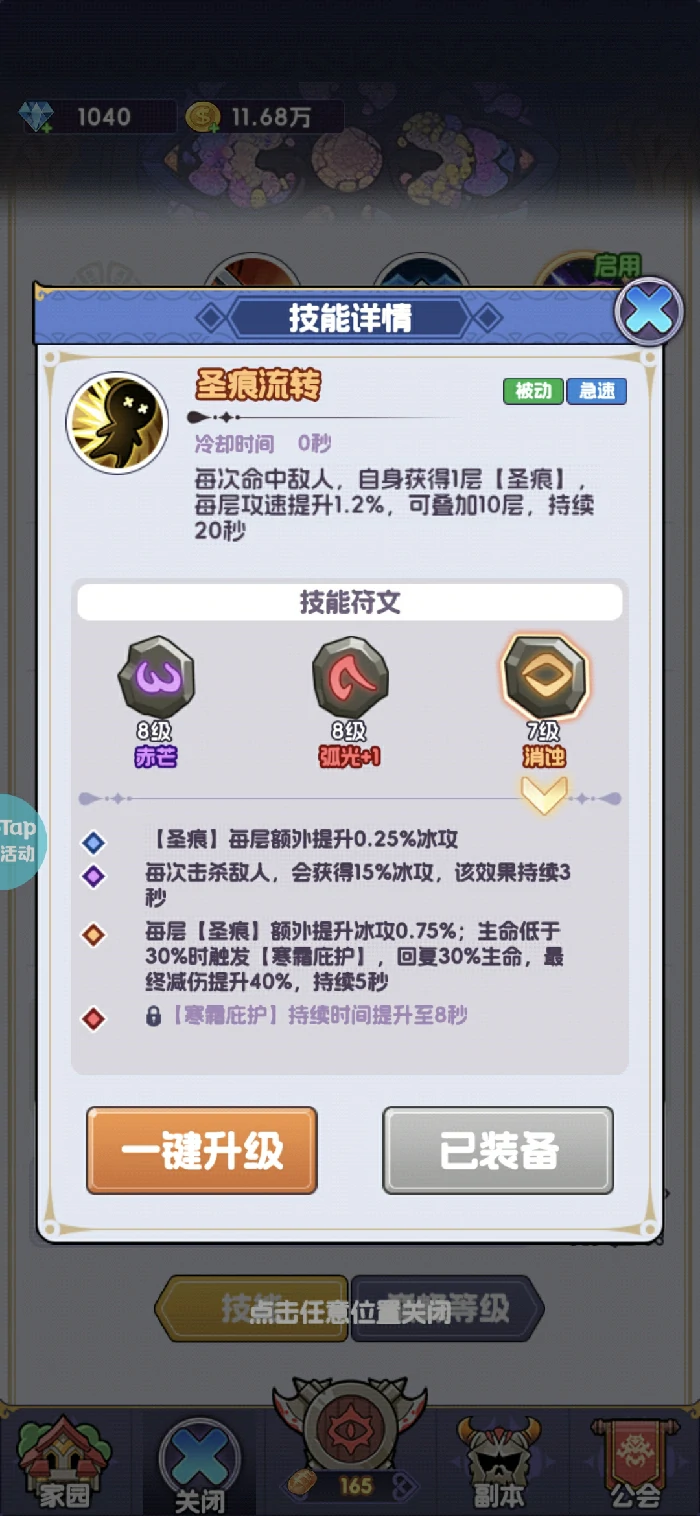 优先用冰系技能,兼顾减速、沉默等减益,搭配护盾和生命回复增益。橙色品质以上圣痕流转符文——消蚀,高压战斗救主角,为核心。