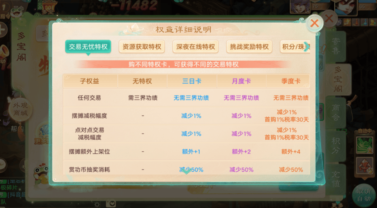 这是自由交易服特权卡的 “核心价值”—— 无特权卡时,摆摊、寄售需要消耗三界功绩(需靠养成玩法慢慢攒),且交易税率高达 4%-8%;开通特权卡后,不仅无需三界功绩,还能享受 1% 的超低交易税(三日卡直接享,月卡 / 季卡首购额外赠 30 天 1% 税率)。以交易 1 亿银两的道具为例,无特权卡需交 400 万 - 800 万税费,有特权卡仅需 100 万,单次交易就能省出 300 万 + 银两。