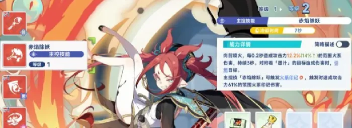 与增益角色配合,爆发能力更突出。主动技能“赤焰除妖”:前方扇形区域持续喷火,0.2秒/次,12.2%攻击力火属性伤害,持续3秒。普通攻击命中附加墨汁状态,此为触发灼烧关键,层数越高额外伤害越显著。火系印记积累到一定数量,额外引发61%攻击力范围火属性伤害,增强元素压制力。