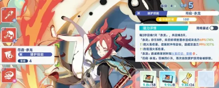 援护技能“召唤赤龙”:战场生成最多3只赤龙协助作战,每2秒召唤1只,存在8秒。召唤物持续喷射墨水,每次69%攻击力火属性伤害。技能结束时赤龙冲撞攻击,命中造成99%攻击力范围火属性伤害。赤龙攻击叠加火系印记,提高输出频率与元素覆盖效率。