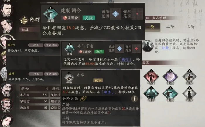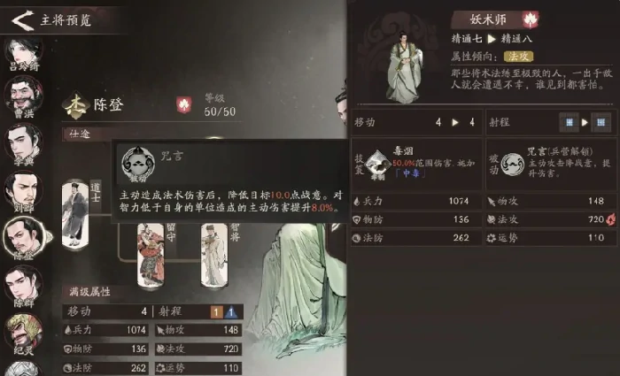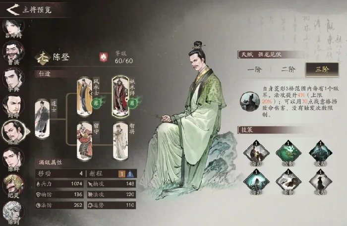 装备优先堆加法术攻击属性,确保输出能力。前期缺乏合适副将用孙资过渡;后期建议更换王朗或蔡邕,提升整体辅助效率。除陈群外,可考虑貂蝉提供治疗支持,或郭嘉通过异常状态增伤强化陈登输出。陈登虽为杰品武将,属性不算顶尖,武力普通,但合理配队下,面对多名敌人仍能打出可观伤害。培养成本低、操作易上手,适合有一定游戏经验的玩家尝试多种阵容组合。