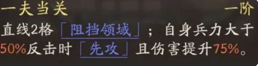 战斗开局,靠普攻触发反击,带群体嘲讽,吸伤害,打范围输出。开天赋一夫当关,前方两格直线挡敌人,兵力超50%持续生效,锁走位,抢先手压制,配合反击打多段。