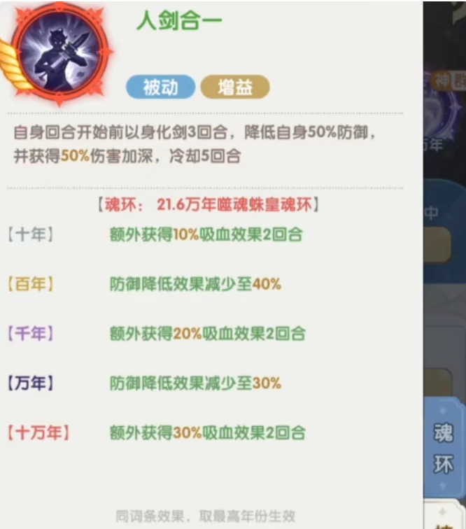 被动“人剑合一”触发神化剑状态,持续3回合:防御降50%,伤害加深50%,附加持续伤害。搭配合适魂环,还能叠加吸血、减防等效果。