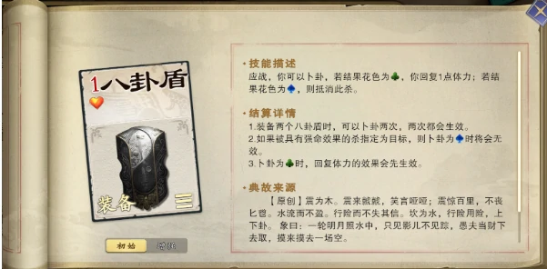 的卢受伤触发卜卦:1-7点摸两张牌,8点弃所有手牌装备并自毁。别在满血满装备时戴,手牌见底或残血时用,规避负面效果。