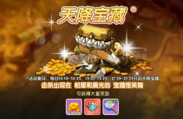 宝箱怪首领刷新机制:绑定限时活动“天降宝藏”,锁定帕里镇、晨光镇浮空区域。每日三个时段必刷:上午10:10-10:20、下午15:10-15:25、晚上21:10-21:25,每个时段10分/15分/20分整点开刷。普通笑箱击杀后15秒原地复活,持续刷怪收益拉满。