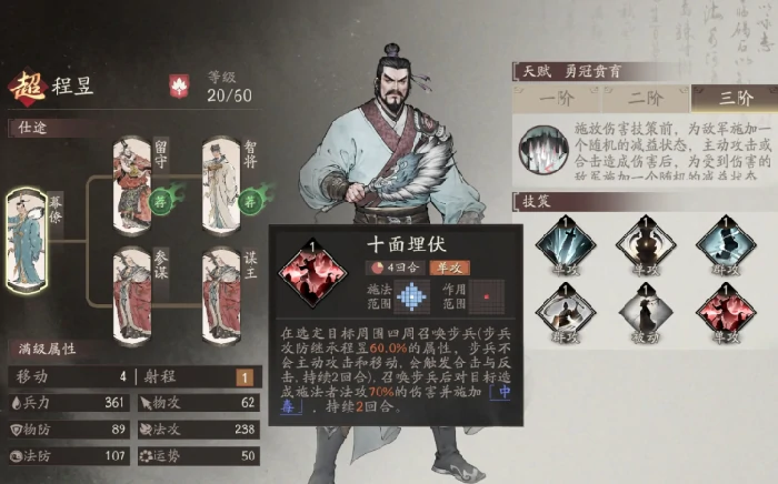 培养路线推荐:优先选强弓火矢方向,火矢灼烧状态结合自身高攻击,高效削减敌方部队和武将生命,清场能力强。游戏初期装配突刺、猛攻类技能快速建立优势;中后期转用触发合击的钩镰与假节钺类技能,增强团队协同效率。