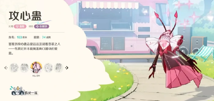 攻心蛊属“喜爱元理”精灵,这类精灵数量少。身高163cm,能量消耗74能焦。自带效果:提升生命上限,开局生成专属“爱之戒”,仅限喜爱元理型精灵佩戴。
