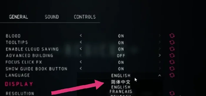 切换成功后,language后方显示“简体中文”,设置界面选项同步变为中文,如“控制”“声效”“分辨率”等。完成设置,退出设置页返回主界面,菜单和文本均以中文显示。不同版本游戏界面细节或有差异,基本设置逻辑一致。