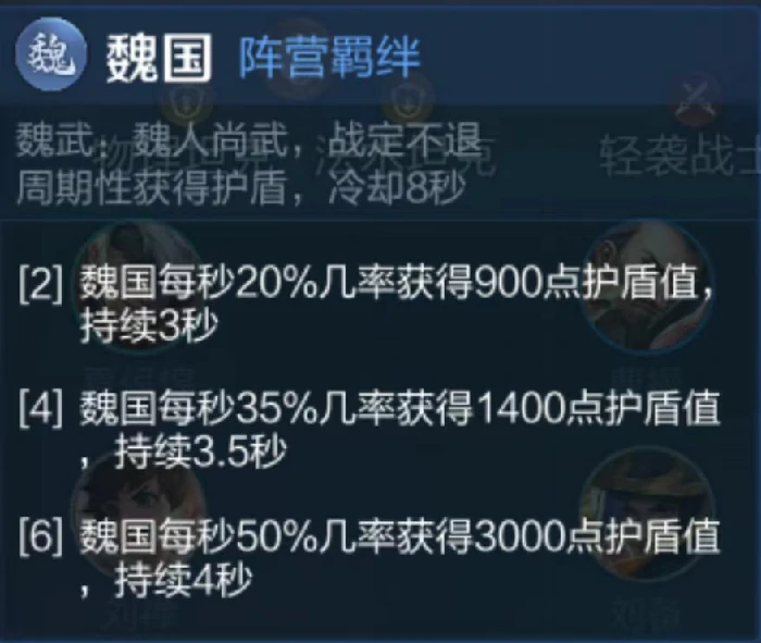 魏国羁绊,防御强悍!仅需两名魏将激活基础效果:每秒20%概率得900护盾。六名魏将时,触发概率飙至50%,护盾值猛增至3000,持续4秒!扛高爆发阵容,稳如泰山!