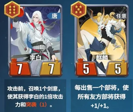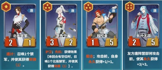 关键卡牌优先拿:武则天,永久加所有唐阵营单位2点阵营值,数量越多加成越猛,必拿核心!李白,出手前召突袭单位,打大量伤害,成型能单挑相柳,记得配张不屈卡。杨玉环,稳定出禁军,维持输出节奏;上官婉儿,随机拿唐阵营部将,加速成型,尽量留住。