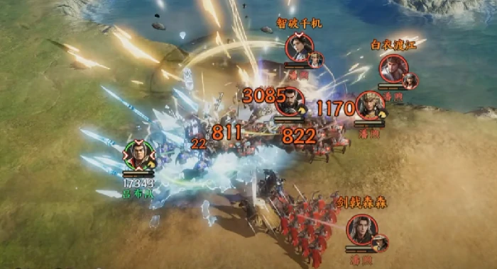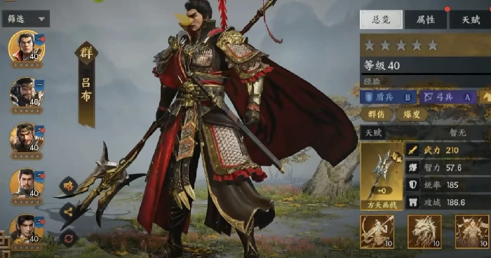 主动技能“方天画戟”:消耗2点策略值,对前方直线三格敌人造成155%攻击力物理伤害,50%几率附加撕裂状态(后续回合持续损失生命)。清场能力优秀,适合密集敌军;面对少量敌人谨慎使用。搭配专属兵种“并州狼骑”,在平原或草原地形移动时策略消耗减半,高效推进和清理野怪。