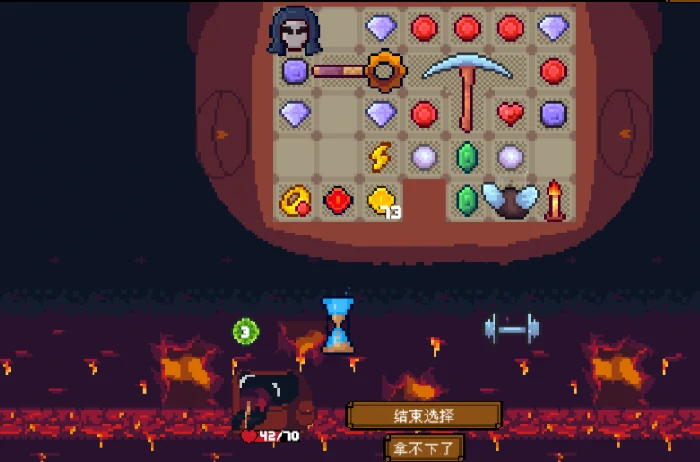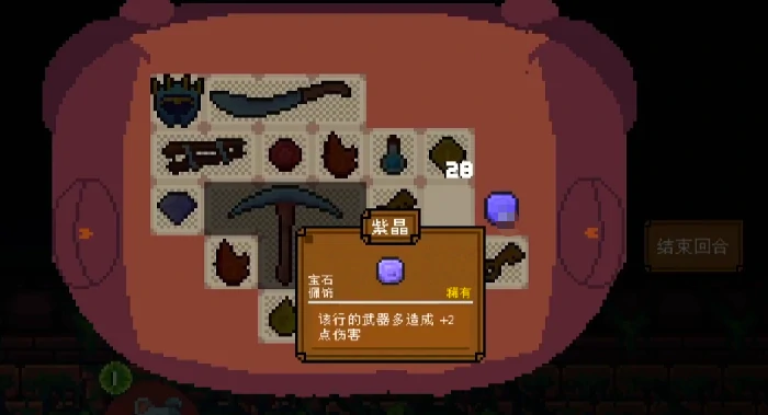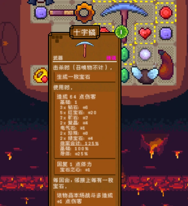 十字镐T字形占四格,基础伤害64点。击败敌人自动生成宝石(对召唤物无效),激活宝石之心每回合额外回1点体力。置于背包中央,相邻每颗宝石加1点战斗伤害,叠加循环提升清怪效率。