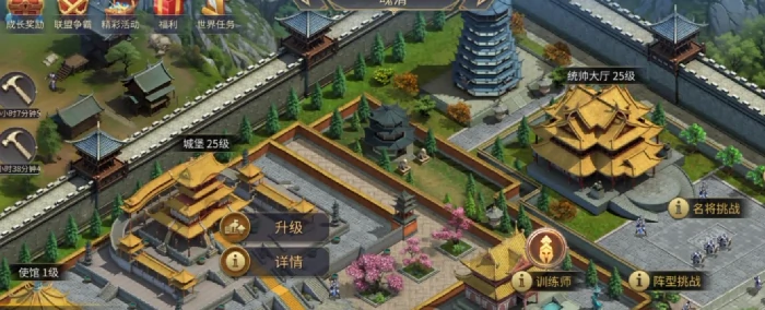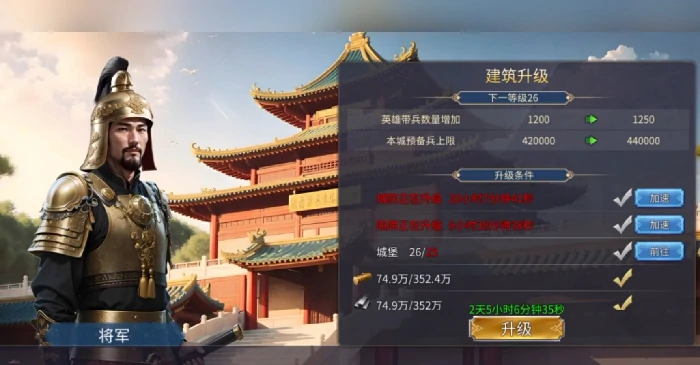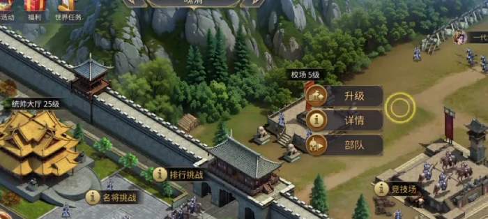 资源充裕时:升统帅大厅,提部队战力;升级校场,加快训练;兵营优先升,缩短士兵训练周期。清野外怪,靠高等级兵营。