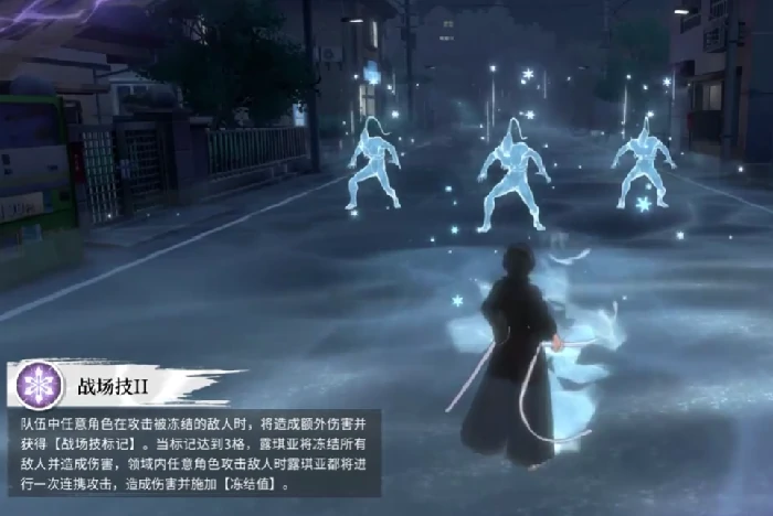 战场技能二:队友攻击冻结敌人触发额外伤害并积累标记,3层标记后发动群体冻结(全体控场+伤害),期间队友攻击触发露琪亚连携攻击,叠加冻结值与输出,提升团队控场输出频率。