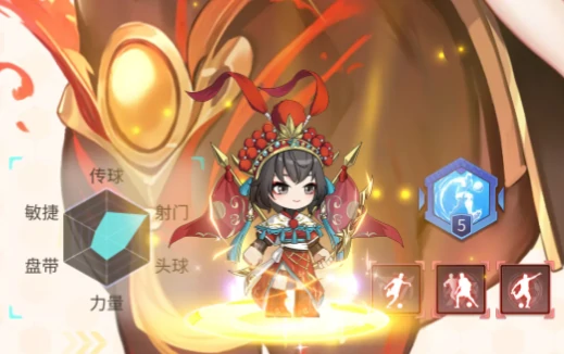 穆桂英:强力前锋。射门撕裂防线。发动招牌技能“曲线射门”(需己方持球),进球几率提20%,无视防守干扰;射门未进,敌方守门员失误率升10%。