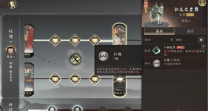 刘备主打团队增益与续航,拉高阵容上限。被动技能仁德是核心,直接提升全队最大生命值18%。友军释放技能后,35%概率为其回复10%生命值,每回合最多触发三次。