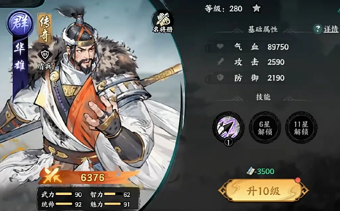 3. 华雄:初始坦度良好,6星解锁首个被动强化防御;11星后,悍不畏死被动配合怒气技能麻痹效果,给血量最低友军加护盾,保护能力优秀。