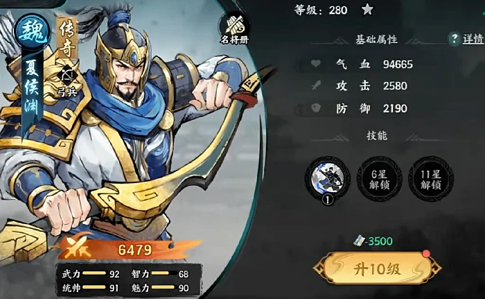 4. 夏侯渊:给魏国阵营附加寒冰效果,怒气技能范围广、伤害高,是魏国输出兼控制核心;未组全红将阵容时上场率高;11星被动千里袭敌加速回怒,技能释放更频繁。