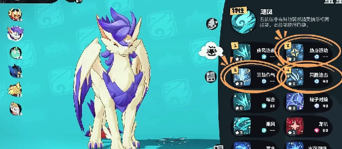 技能配置顺序:热身运动→三鼓作气→乘胜追击。激活“迅捷”效果需队伍有另一只同技能翼系精灵,必配翼龙。